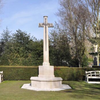 The field of honor consists of rows of white upright gravestones and is screened off by a hedge and a fence. The field of honor has a Cross of Sacrifice, designed by Sir Reginald Blomfield. Blomfield designed the memorial cross when he was a landscape architect who designed dozens of military cemeteries after the First World War. This cross can be found in hundreds of military cemeteries of the CWGC. In the Netherlands it is located in 40 different places.